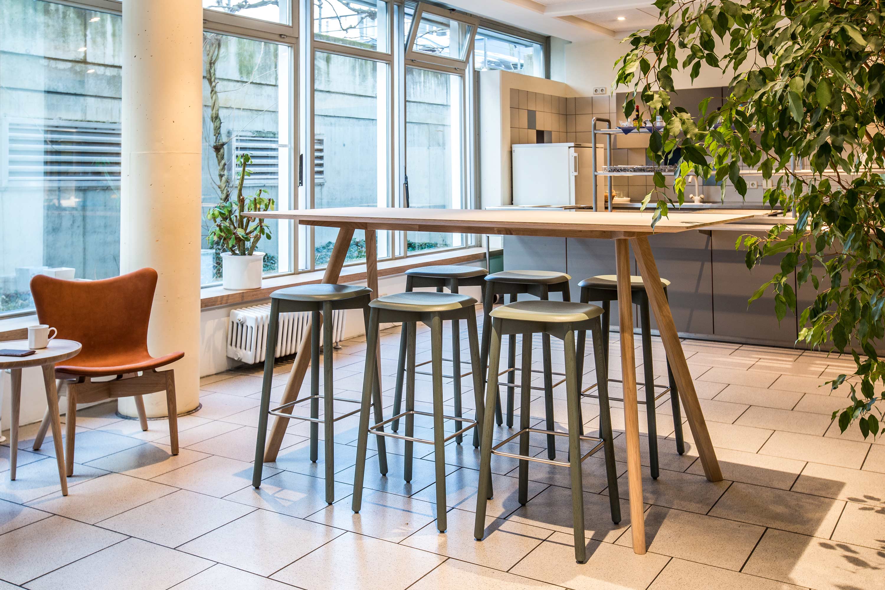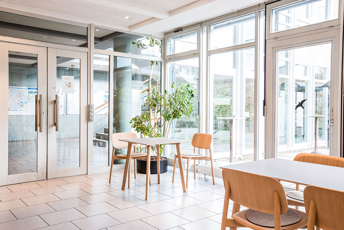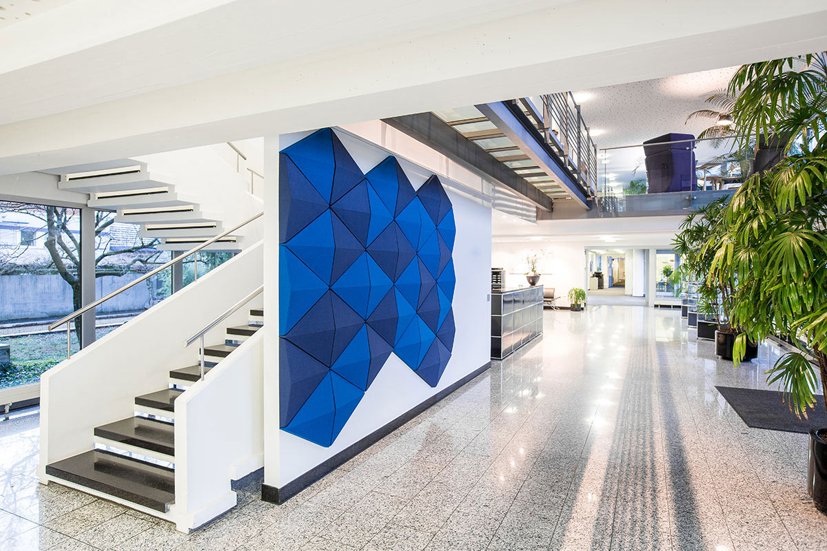 Modernisierung der Mensa und die Erschaffung eines neuen Aufenthaltsbereiches mit Einbindung von Akustikmodulen als Kunstobjekt im Foyer des Gebäudes. Das Streben nach Nachhaltigkeit und die Rückbesinnung auf die Natur als eine Reaktion auf die Schnelllebigkeit und Reizüberflutung unserer digitalen Zeit.